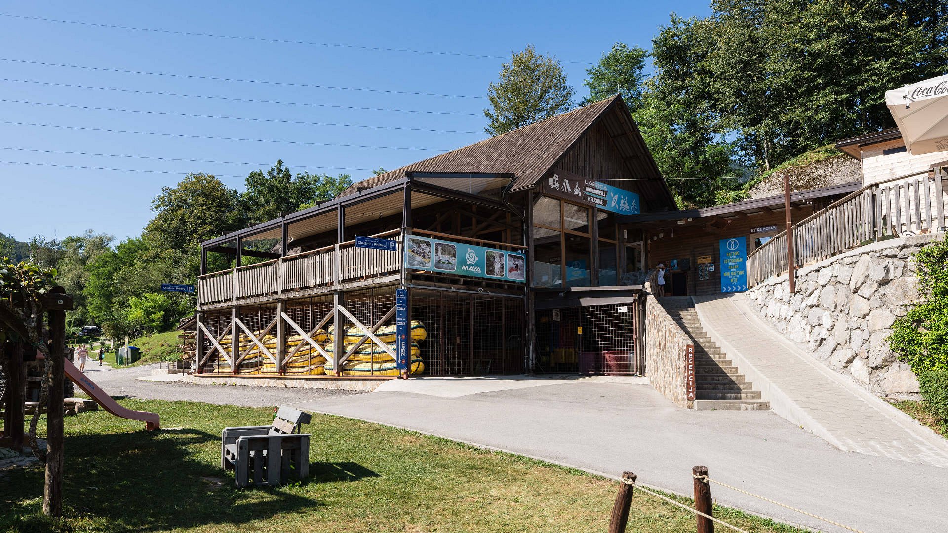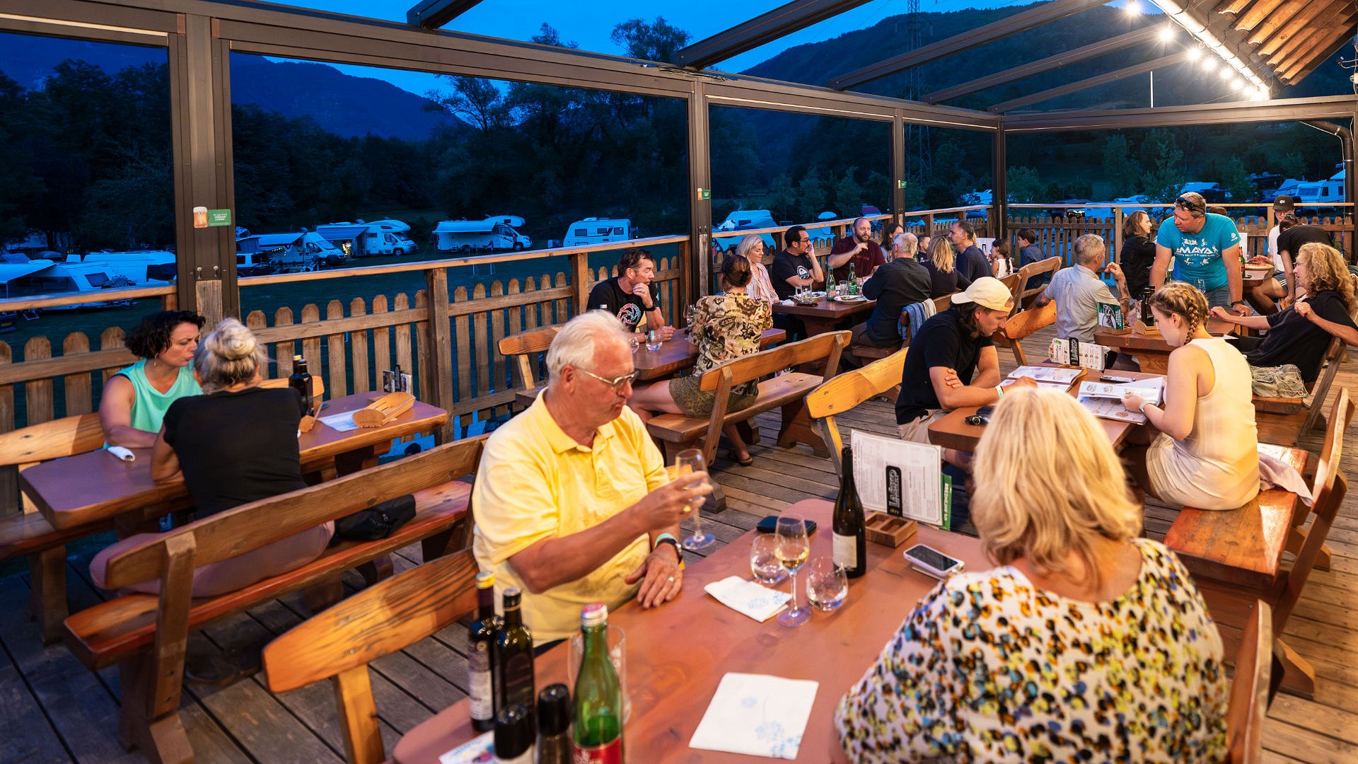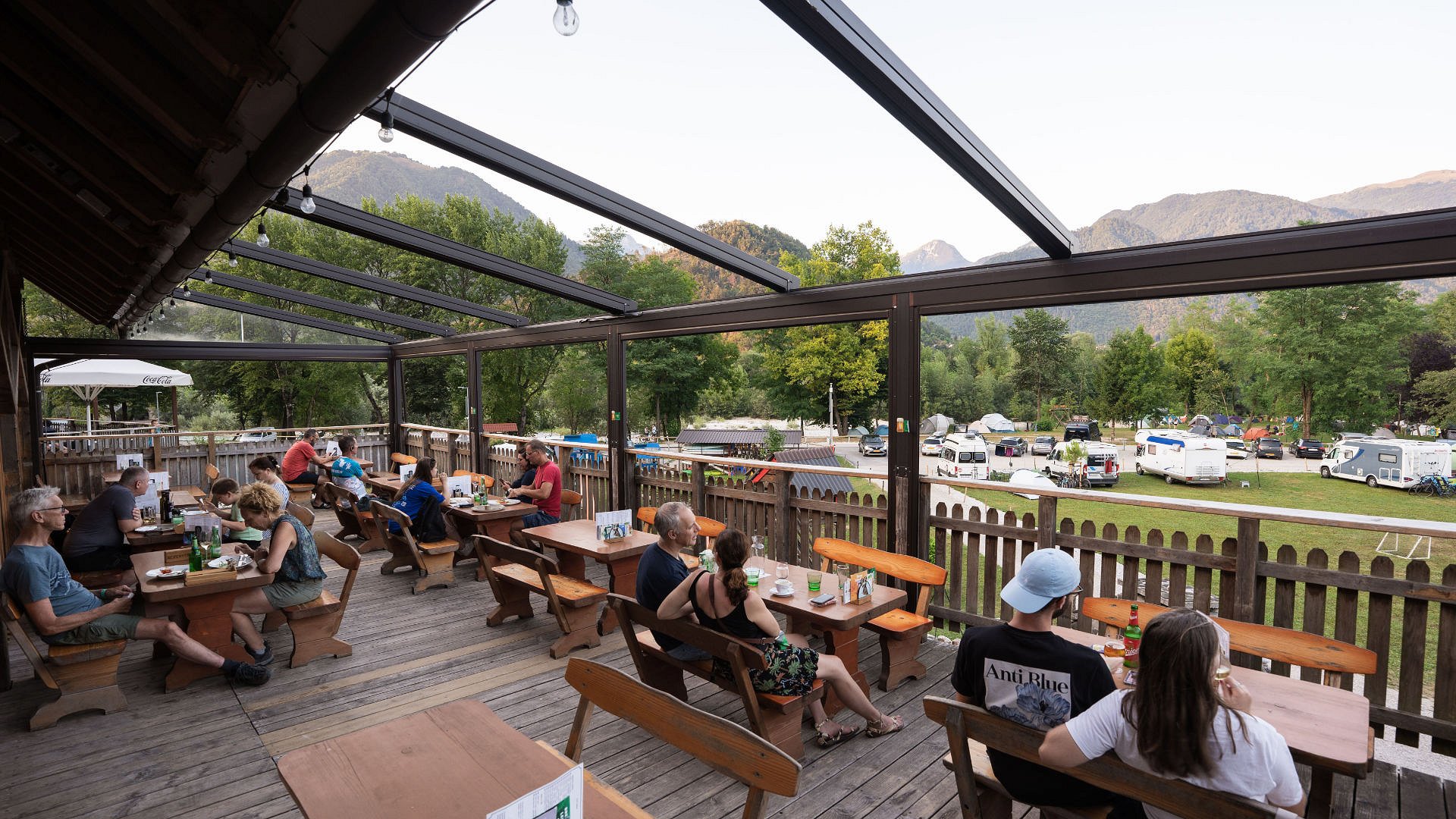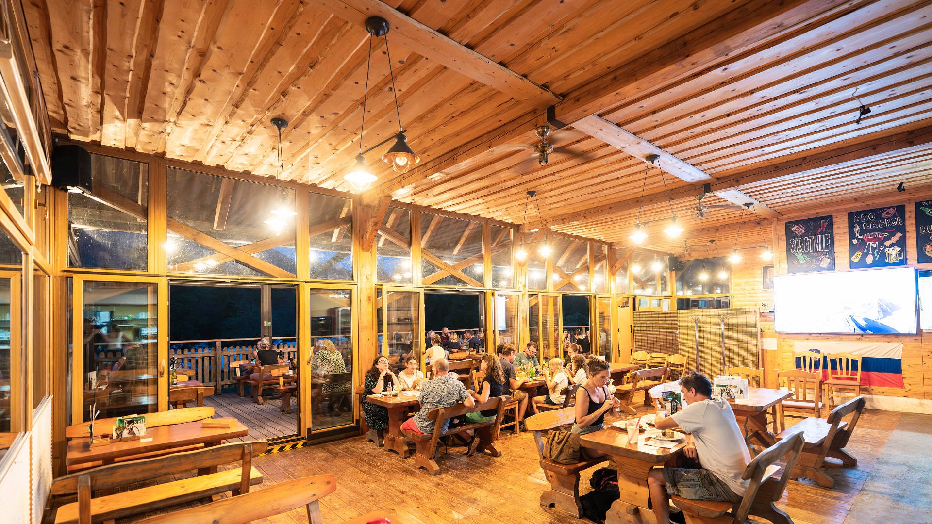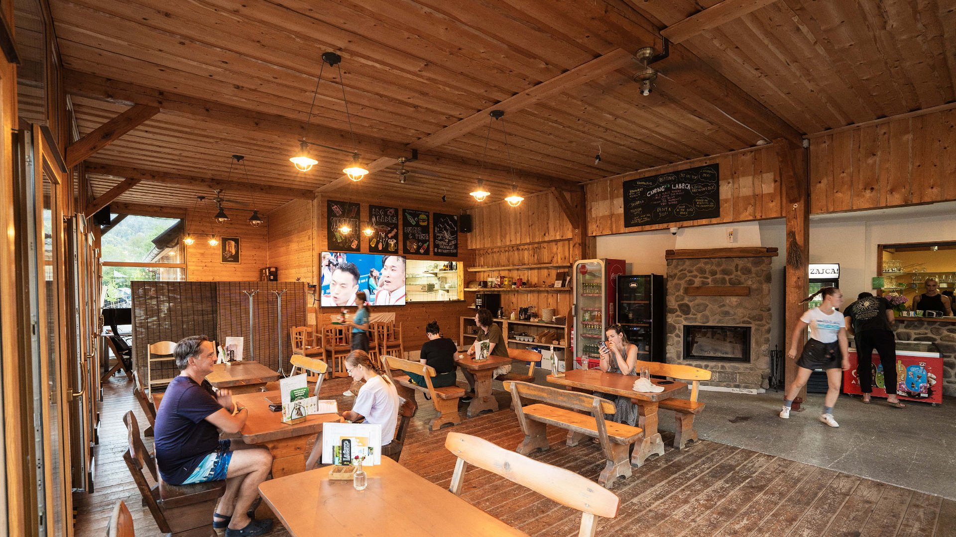 Restaurant Labrca is located within Camp Labrca, in a quiet and scenic location by the Soča River. The restaurant is divided into a comfortable indoor dining area and a covered terrace, offering beautiful views of the surrounding Tolmin hills and allowing guests to enjoy their meal in various weather conditions.